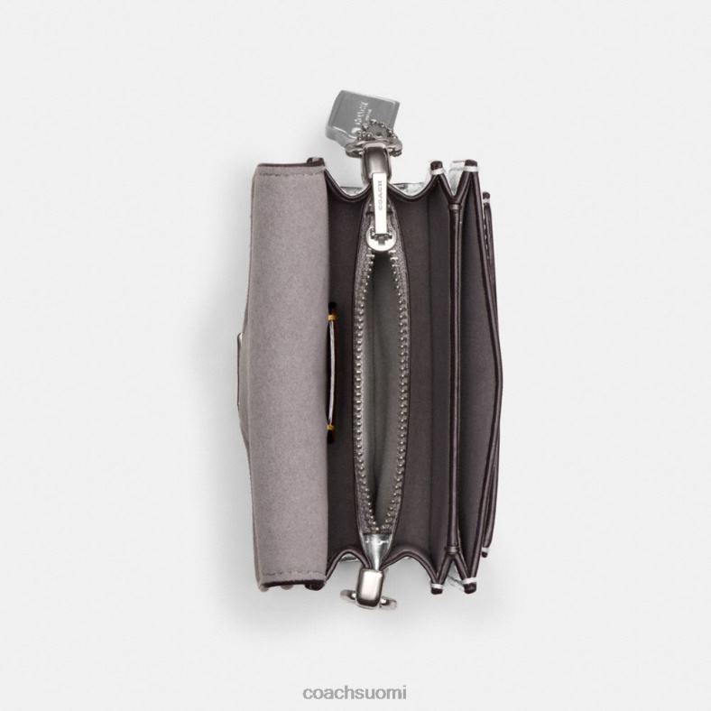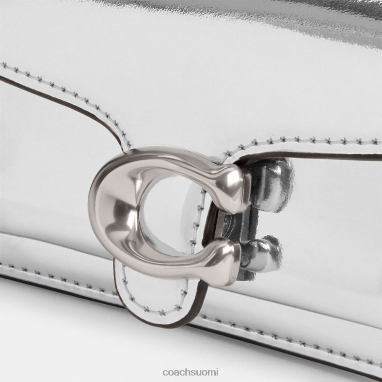 Minä. teimme pienennetyn version asiakkaiden suosimasta tabby-laukusta, jossa oli kaikki samat yksityiskohdat kuin alkuperäisessä. se on viimeistelty tunnusomaisella laitteistollamme ikonisen kosketuksen luomiseksi, ja se on valmistettu kiiltävästä peilimetallinahastamme. Monipuolisessa suunnittelussa on kaksi irrotettavaa hihnaa, joita voi kantaa käsin tai käyttää poikkirungossa, ja kaksinkertainen sisäosa käteisen, korttien, korvanappien ja avainten järjestämiseen. (Hienot asiat tulevat pienissä pakkauksissa.)