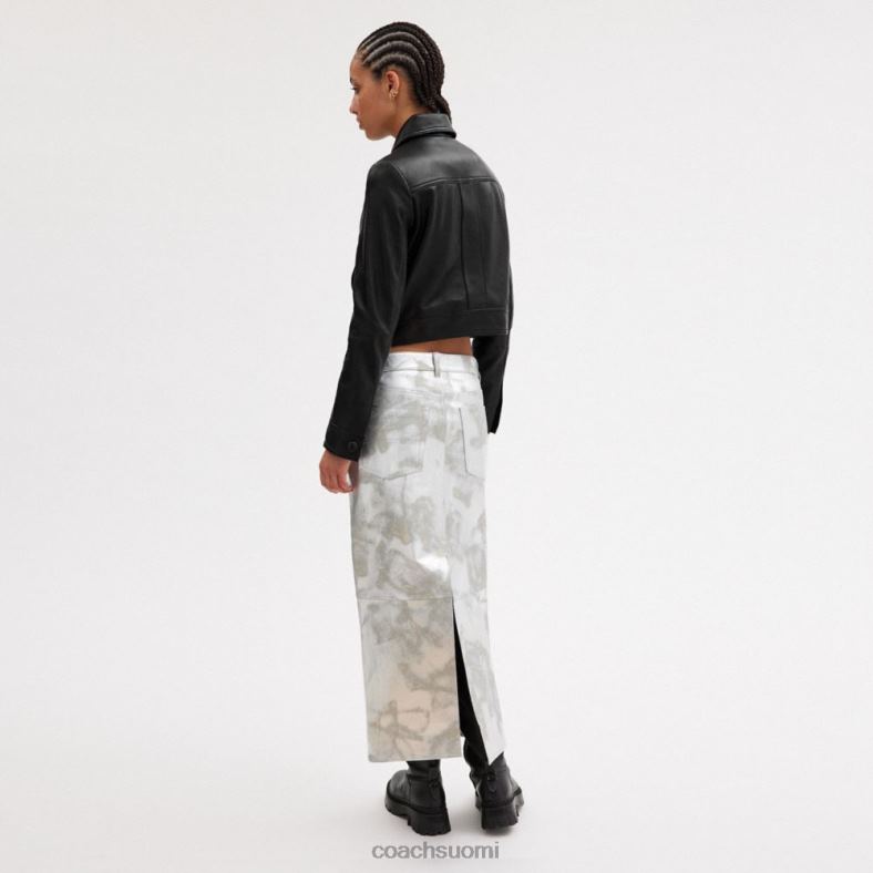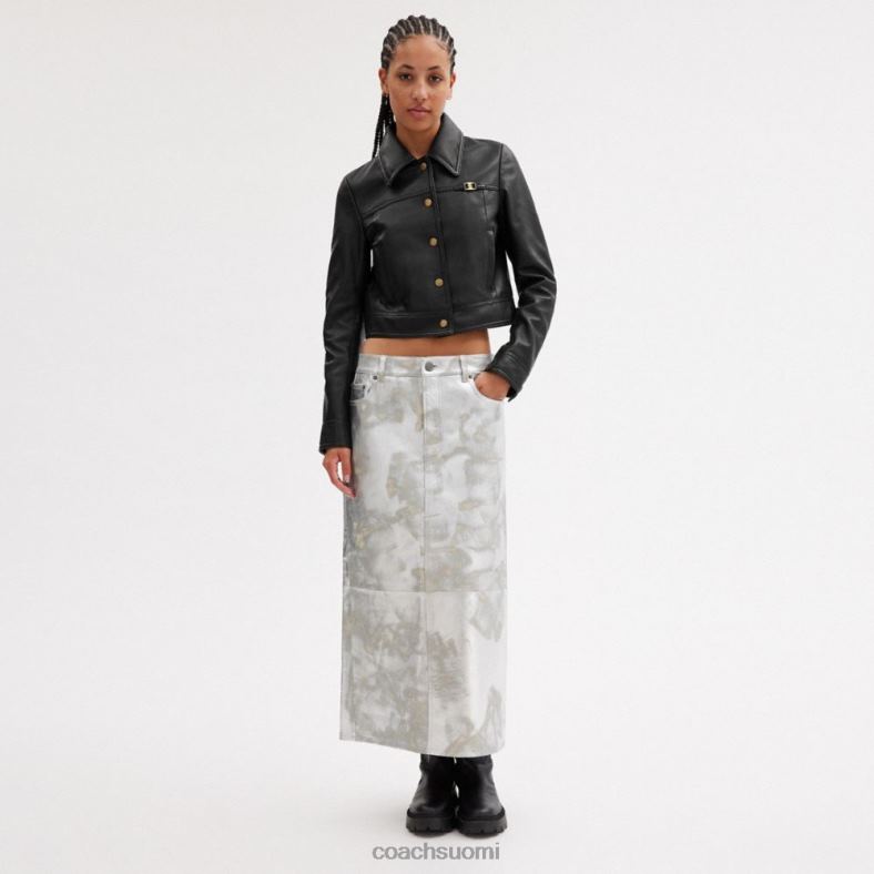 Tämä istuva kutistettu takki on valmistettu pehmeästä joustavasta nahasta, ja siinä on yksityiskohtainen kiillotettu perintösolkimme. laatikkomainen, hieman rajattu siluetti on viimeistelty perinteisellä terävällä kauluksella, taskutaskuilla ja painonapeilla.